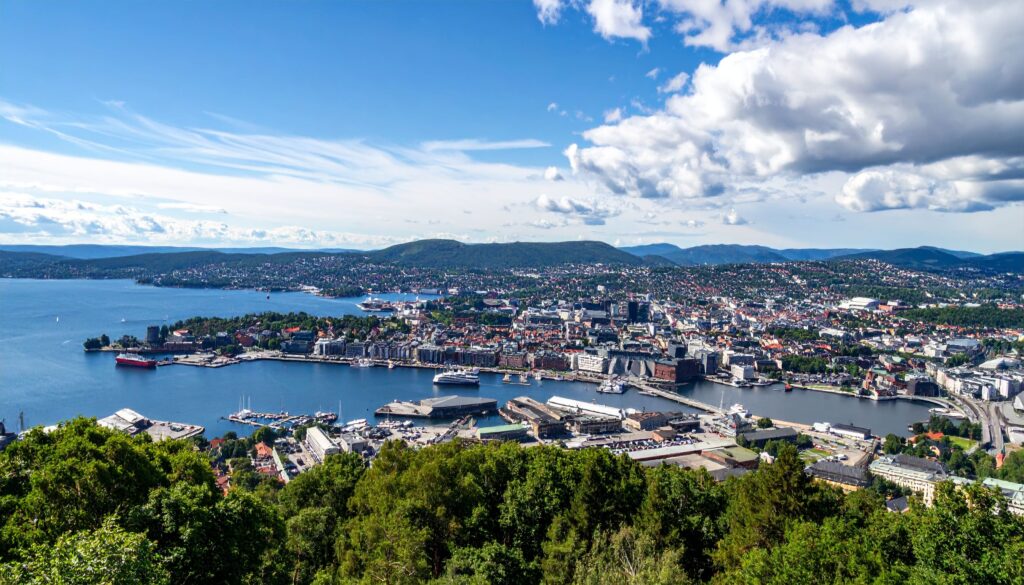 Oslo liegt am inneren Oslofjord und verbindet eine kompakte Innenstadt mit ausgedehnten Wald- und Seengebieten, wodurch sich Stadtbild, Atemrhythmus und Alltagswege ungewöhnlich eng verzahnen. Während das Ufer zwischen Aker Brygge, Tjuvholmen, Sørenga und dem Opernhaus eine durchgehende Hafenpromenade bildet, steigen am Rand die Hügel zur Nordmarka auf, die mit Kieswegen, Seen und stillen Mooren fast wie eine zweite, grüne Stadt wirkt. Deshalb entsteht ein Stadtgefüge, das kurze Wechsel erlaubt: Eben noch an der Kaikante mit Blick auf Boote und Backstein, wenige Minuten später bereits im lichten Kiefernwald mit weichem Boden und gedämpfter Geräuschkulisse.
